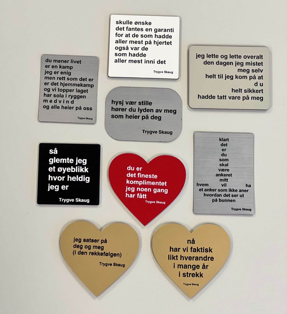 Utforsk vår verden av unike magneter, et hjertelig produkt fra vår skiltavdeling. Vårt privilegerte samarbeid med den talentfulle kunstneren Trygve Skaug bringer poesi og skjønnhet til hver magnet. Hvert dikt og motiv er nøye utvalgt for å berøre sjelen.